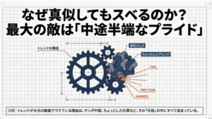 伸びない動画の多くは、「トレンドの真似事」に自社の中途半端なオリジナリティ(プライド)を混ぜてしまった結果、ただの「スベっている真似」になっているケースがほとんどです 。そのトレンドが大元の動画でウケている理由は、テンポや間、ちょっとした仕草など、その「元祖」の中にすべて詰まっています。