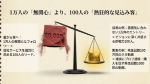 企業アカウントが本当に追うべきは、1万人の「無関心なフォロワー」ではなく、たった100人でもいいから自社のサービスを強烈に求めている「質の高い見込み客(リード)」です。