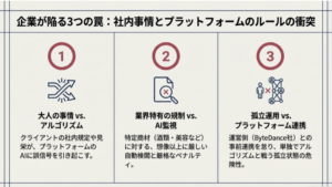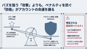 動画がおすすめに表示されなくなる、あるいは突然動画が削除される、最悪の場合はアカウントが凍結(BAN)されるなど、そのリスクは常に潜んでいます。「社内事情」や、業種特有の規制を甘く見ていると、思わぬ罠に陥ることになります。