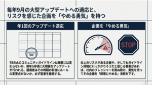 TikTokのコミュニティガイドラインは、頻繁に大きく変わるものではありませんが、年に1回(例年9月頃)のペースで大きなアップデートが行われる傾向があります 。運用担当者は、その時期の前後にルールの変更点がないか、必ずチェックを怠らないようにすべきです 。