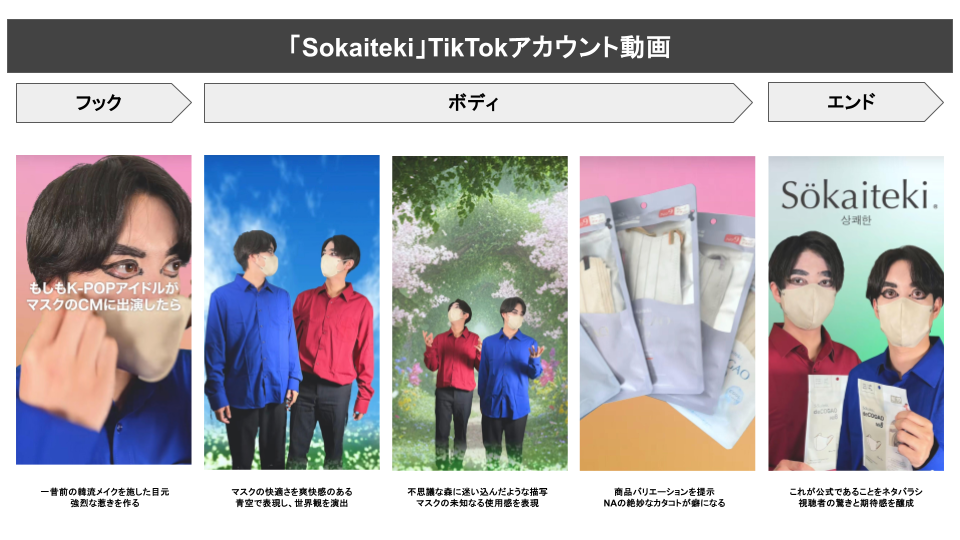 マスクのつけ心地という体感的な価値を、言葉ではなく爽快感のある青空の映像で表現。視聴者は説明を読むのではなく、映像を通じて快適さを直感的に”感じ取る”ことができます。機能を語らずに世界観で伝える、TikTokらしいアプローチです。